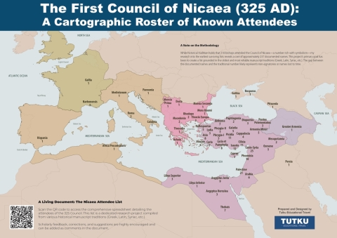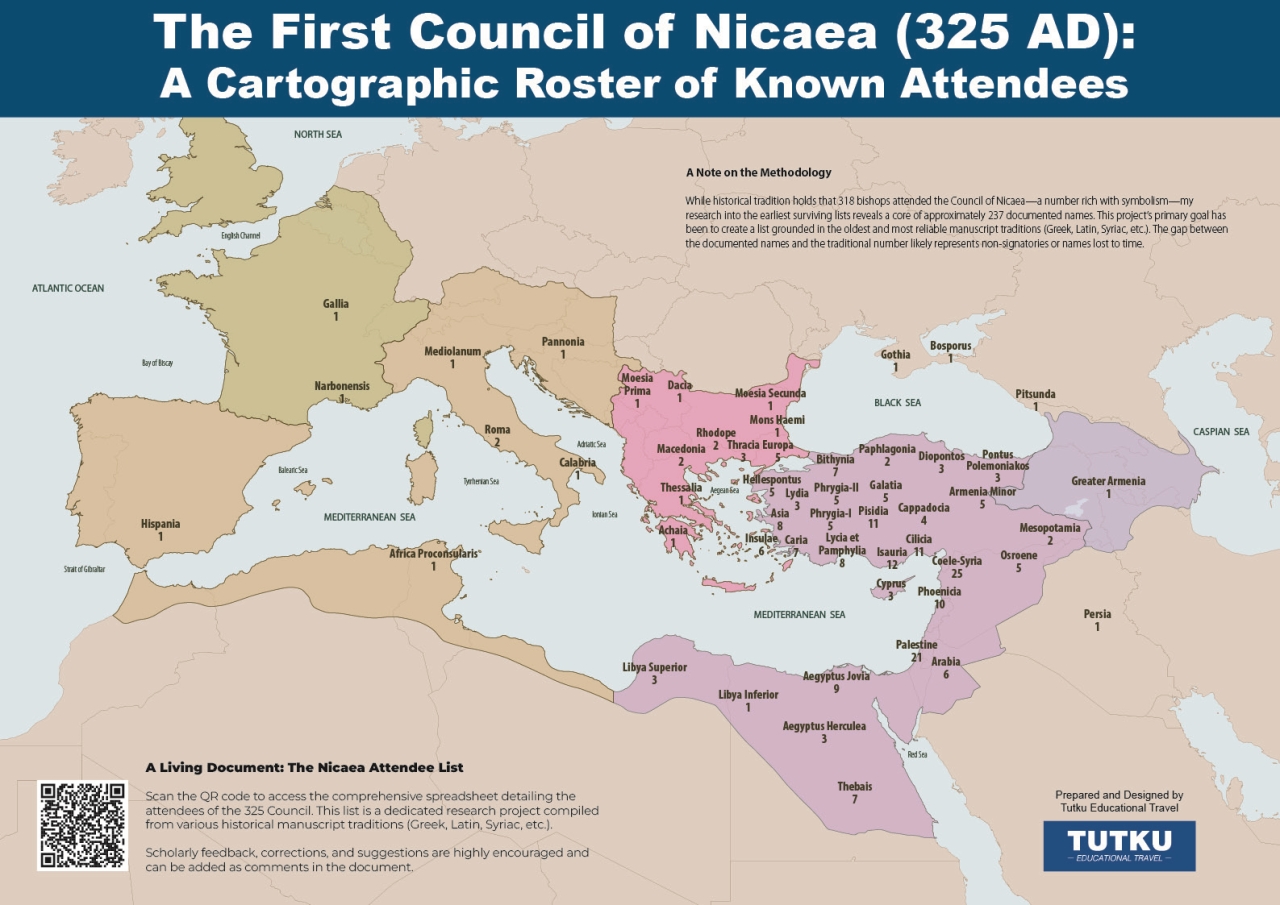 This map visualizes the geographical origins of the known attendees of the First Council of Nicaea (325 AD). Each point represents the episcopal see or region from which a participant traveled to attend this pivotal event in Christian history.